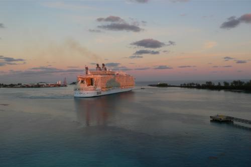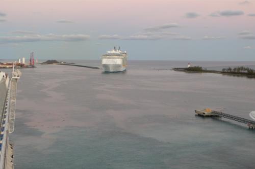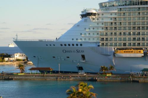 Es lag schon ein Schiff im Hafen, das muss aber noch vom Vortag dort geankert haben. Denn es verließ am frühen Morgen wieder den Hafen. Dafür kamen 4 weitere Kreuzfahrtschiffen nacheinander an. Als erstes das z.Zt. größte Kreuzfahrtschiff der Welt, die „Oasis of the Seas“, mit über 6.000 Passagieren an Bord.