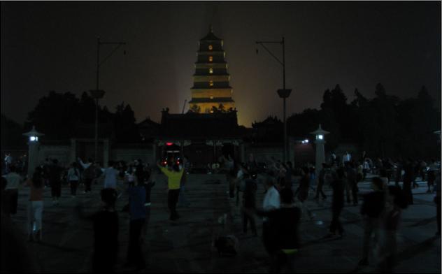Auch hier wieder Tanz. Im Hintergrund die Wildganspagode, welche wir am nächsten Tag besichtigen werdenNach einigen Metern Fußweg kamen wir gerade zu rechten Zeit, um den Beginn der Wasserspiele zu erleben.>>> weiter