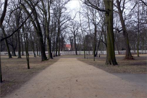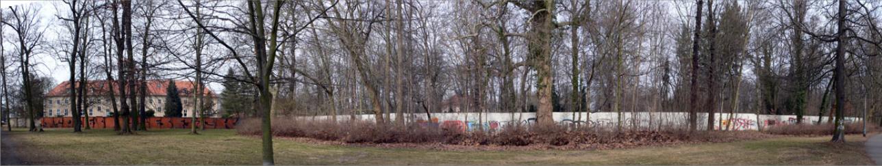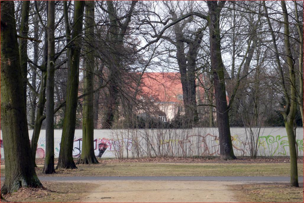 Blick von der Schlossallee auf die Mauer. Im Hintergrund das Schloss